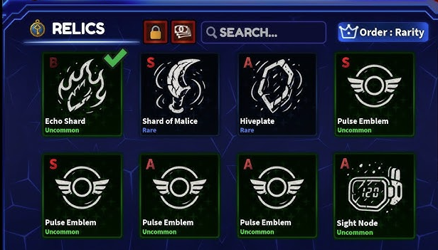 Mẹo: Sử dụng XP Boost hoặc Drop Boost (mua bằng Robux hoặc Tickets) để tăng tỷ lệ rơi Relics.