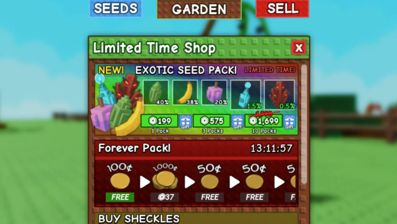 - Mua Exotic Seed Pack: Mỗi gói có giá 199 Robux. Bạn có thể mua 1 gói (199 Robux), 3 gói (575 Robux), hoặc 10 gói (1.699 Robux) để tiết kiệm chi phí. Tỷ lệ nhận Cursed Fruit là 0.5%, nên mua nhiều gói sẽ tăng cơ hội.