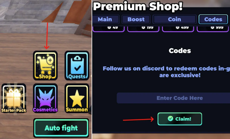 - Trong giao diện Premium Shop, chọn tab Codes (góc trên bên phải).