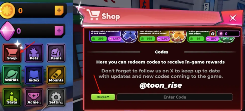 - Mở Shop: Nhấn vào nút Shop bên menu trái.