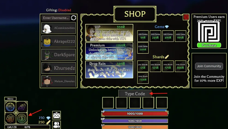 - Mở cửa sổ nhập mã: Nhấn vào Shop để mở menu.