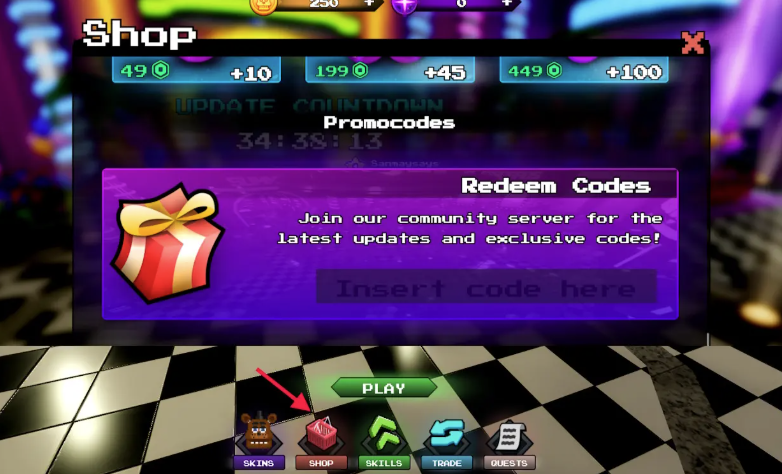 - Tìm mục Promocodes: Cuộn xuống cuối cửa sổ Shop để thấy phần nhập mã.
