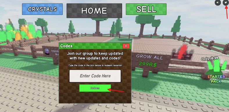 - Đảm bảo bạn đã tham gia Grow Crystals Roblox Group để mở khóa tính năng nhập mã.