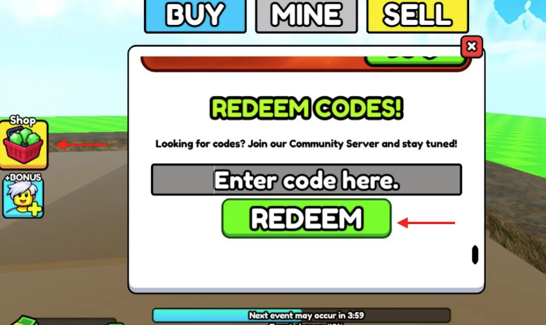 - Dù mã code hiện tại không cung cấp Coins hoặc Spins trực tiếp, bạn có thể bán quặng từ rifts để tích lũy tài nguyên. Sử dụng Spins (nếu có từ sự kiện) để thử vận may nhận pickaxes hiếm.