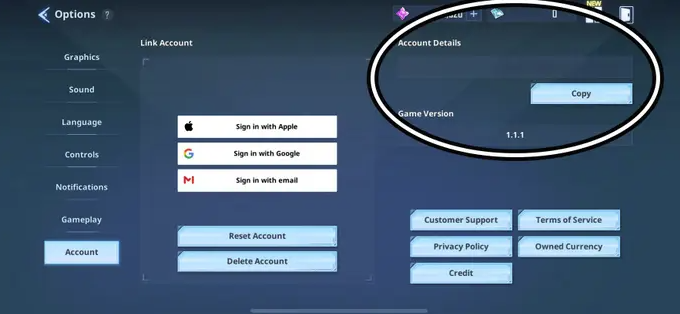 - Lấy Member Code: Trong game, vào Settings > Account Settings, sao chép Member Code (chuỗi 32 ký tự) bằng nút Copy.