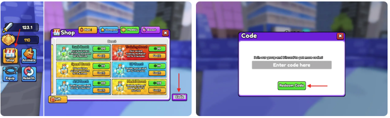 - Mở cửa sổ nhập mã: Nhấn vào nút Code ở góc dưới bên phải của cửa sổ Shop.