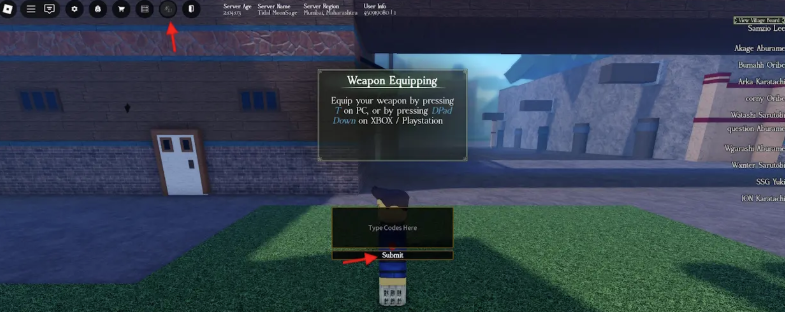 - Nhập mã: Điền mã code từ danh sách trên vào ô “Type Codes Here”.