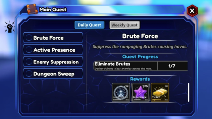 Weekly Quests yêu cầu nhiều thời gian hơn (30 phút đến vài giờ), làm mới mỗi thứ Hai lúc 00:00 UTC. Phần thưởng giá trị, thường bao gồm Legendary Powder Dust hoặc Shadow hiếm.