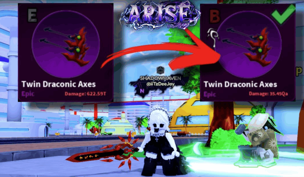 Arise Crossover là tựa game Roblox lấy cảm hứng từ Solo Leveling, nơi người chơi xây dựng đội quân bóng tối (Shadows) và sử dụng các vũ khí mạnh mẽ để chinh phục các hòn đảo đầy thử thách. Trong số các vũ khí, Twin Draconic Axes (Cặp Rìu Rồng) nổi bật như một món vũ khí Epic với sát thương khủng 311.30 nghìn tỷ (311.30 Trillion DMG), vượt xa Reaper’s Scythe từng thống trị meta. Với giá mua lên đến 86.58 Quadrillion (86.58 Qa) cash, đây là vũ khí đáng mơ ước cho bất kỳ ai muốn thống lĩnh Dragon City và leo rank nhanh chóng.