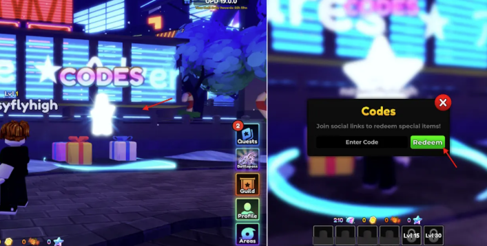 - Tại lobby, đi đến khu vực Codes (vòng tròn màu xanh ngay trước phòng Raids, gần sân chính).