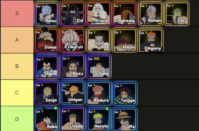 Anime Saga Tier List là bảng xếp hạng các unit trong game Anime Saga dựa trên sức mạnh tổng thể, bao gồm sát thương, khả năng AOE (tấn công diện rộng), thời gian hồi chiêu, và tính ứng dụng trong các chế độ chơi như Story, Raids, hoặc PvP. Tier List được chia thành các cấp bậc: