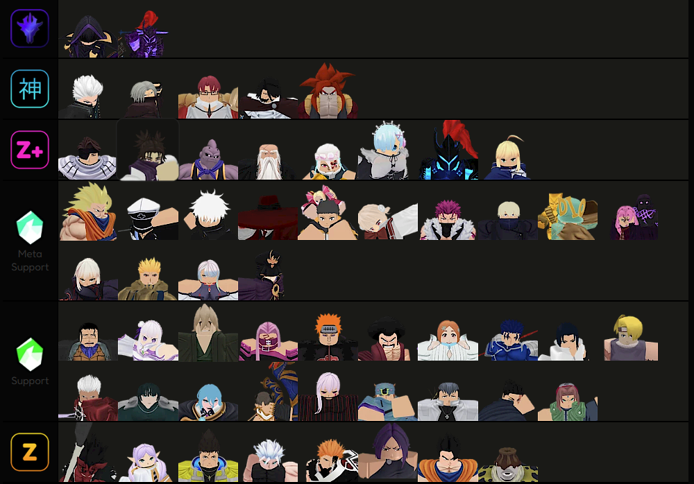 Tier list Anime Vanguards là bảng xếp hạng các unit dựa trên hiệu quả của chúng trong các chế độ chơi như Story, Infinite, Raids, Challenge, và Paragon. Các unit được chia thành các bậc (tiers) từ S+ (mạnh nhất, meta) đến D (yếu, không nên sử dụng). Xếp hạng dựa trên các yếu tố:
